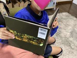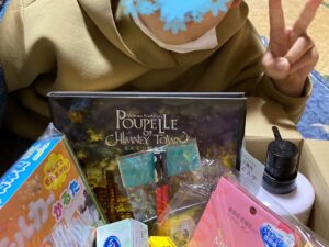 モルカーのかるたや、プペルの絵本に大喜びしています。